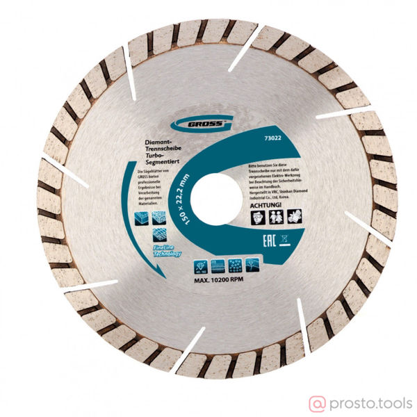 Универсальный алмазный диск ТМ GROSS предназначен для резки материалов: бетон, армированный бетон, кирпич, камень, гранит, шлакоблок, мрамор, тротуарная плитка. Тип диска 1A1RSS Turbo (Турбо-сегментный) совмещает в 1 диске преимущества сегментного и турбированного типа. Режущий сегмент высотой 10 мм, с высокой концентрацией крупных синтетических алмазов ? 40–50 мкм повышает износостойкость диска и увеличивает скорость реза. Для использования на УШМ (болгарке) соответствующего типоразмера. Сухой рез, без использования водяного охлаждения. Рекомендован для профессионального использования и большого объема работ.