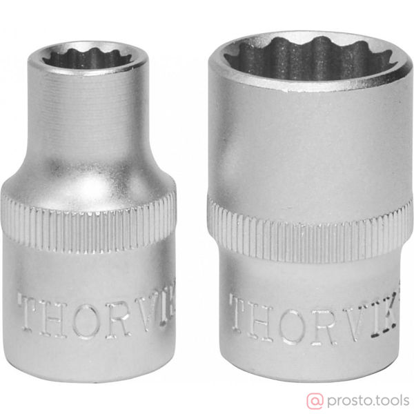 Головка торцевая 12-гран. 1/2" 14мм. Торцевые головки Thorvik изготовлены с применением технологий, позволяющих передавать усилия, превышающие расчетные по современным стандартам на 30%. Широкий диапазон размеров, типов и профилей, высокая точность обработки, качественная хромованадиевая сталь и устойчивое хромоникелевое покрытие делают инструмент надежным и долговечным. Торцевые головки Thorvik являются основной для создания систем сборного слесарно-монтажного инструмента. Изделия производятся на современном оборудовании по стандарту DIN 3124, в соотвествии с ГОСТ 25604-83. Область применения 12-гран. головки удобнее в применении по сравнению с 6-гран, так как какой профиль предоставляет большую свободу для позиционирования головки на крепеже. Однако, он обладает меньшим по площади пятном контакта и воздействие на крепеж, особенно с высокой нагрузкой, может повредить грани крепежной детали, что в сочетании с большим количеством концентраторов напряжения несколько ограничивает применяемые максимально допустимые нагрузки, опять же, по сравнению с 6-гран. головками.