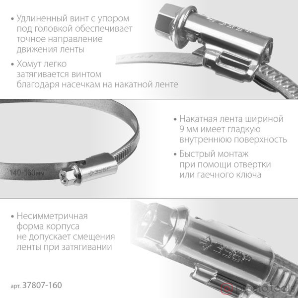 Червячный хомут состоит из штампованной ленты и винта с червячной резьбой. Накатная лента имеет гладкую внутреннюю поверхность, которая защищает шланг от повреждений. При вращении винта лента сжимается, благодаря чему создается надежное и герметичное соединение шлангов, различных труб, и т.д. Червячный винт снабжен шестигранной головкой под ключ 8 мм и шлицем PH, что позволяет использовать при монтаже гаечный ключ или шлицевую отвертку.