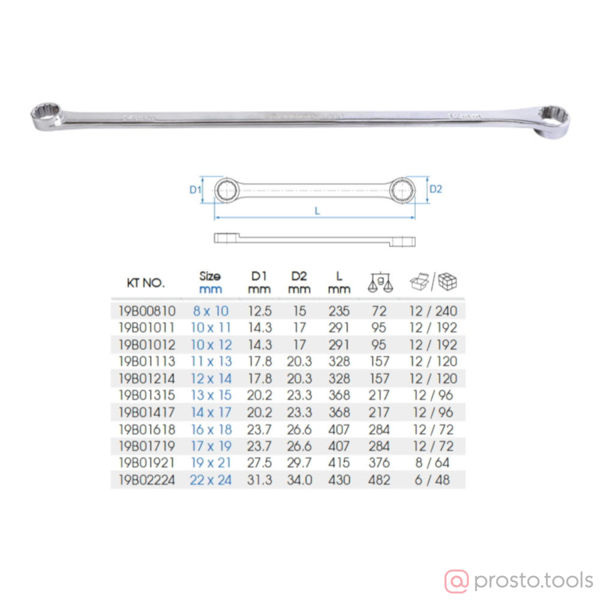 Новые накидные прямые удлинённые ключи серии 19B0 марки KingTony предназначены для выполнения работ по монтажу и демонтажу узлов и деталей авто, мото и другой техники. Из отличительных особенностей ключей этой серии можно выделить удлинённый корпус и накидной профиль прямого действия, позволяющие выполнять работы в местах, где другие форматы ключей не подходят.