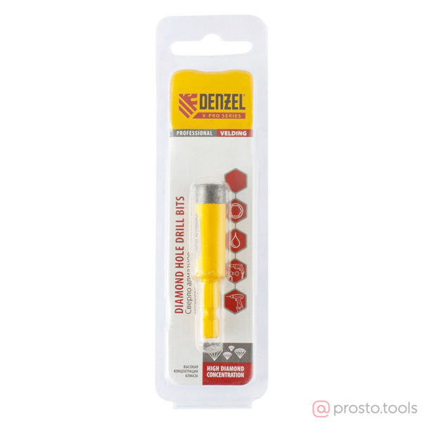 Алмазное сверло ТМ Denzel предназначено для сверления отверстий в керамограните, стекле, керамической плитке, мраморе при помощи дрели или шуруповерта. Обеспечивает точное сверление без сколов. Высокая концентрация алмаза и метод горячего спекания режущего слоя позволил значительно увеличить стойкость и производительность сверла, по сравнению со сверлами выполненными гальваническим методом. Благодаря 6-х гранному хвостовику сверло не прокручивается в патроне во время работы. Сверление производить в безударном режиме с использованием водяного охлаждения. Для облегчения процесса засверливания рекомендуется использовать кондуктор арт 72833.