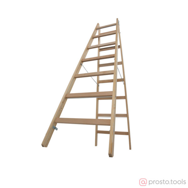 Прочная надежная стремянка из дерева, пригодна для выполнения самых разнообразных работ. Стальные шарниры прикручены прочно и многократно резьбовыми креплениями Для защиты от расхождения использованы цепные перемычки Безопасность транспортировки обеспечивается стопорными крюками Боковины из высокосортной древесины без сучков