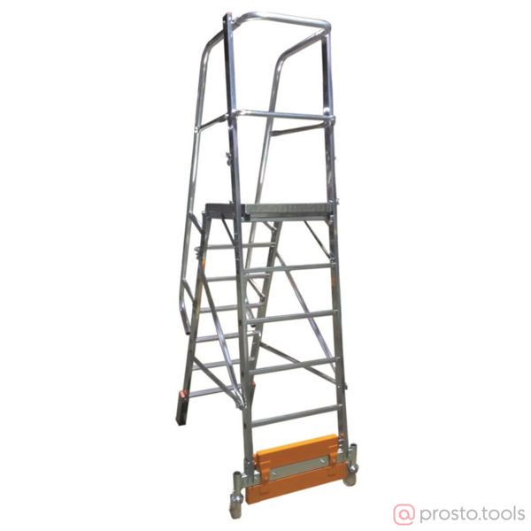 Небольшая ширина, идеально подходит для работы вблизи стеллажа Размеры площадки: 600 х 700 мм, рифленый алюминий Трехсторонние перила платформы Ø 40 мм и высотой 1,00 м, со встроенной защитной планкой на уровне колен Геометрически замкнутые, плотно прилегающие стыки между поручнями и перилами платформы повышают уровень безопасности 4 самостопорящихся направляющих ролика (Ø 125 мм), из которых 2 оснащены фиксаторами, облегчают перемещение и обеспечивают безопасность Изделие поставляется в виде предварительно смонтированных узлов