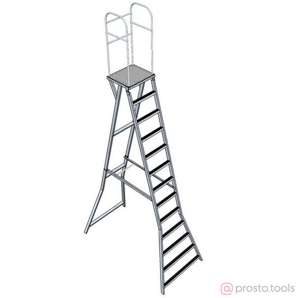 Алюминиевая лестница с платформой Л-312А (2,0) 8 ступеней предназначена для электромонтажных, строительных, ремонтных и других видов работ на высоте до 6 метров. Алюминиевая лестница с платформой Л-312А представляет собой сварную конструкцию, состоящую из двух опорных стоек со стяжкой и платформой с ограждением. Платформа с ограждением предназначена для удобства и безопасности ведения работ на высоте. Платформа имеет ограждение из труб, передняя сторона которого представляет собой подвижную перекладину, жестко закрепляемую фиксатором. Во избежание скольжения по поверхности пола и повышения электробезопасности стойки лестницы снабжены резиновыми наконечниками. Опорные стойки лестницы при транспортировке складываются, ограждение снимается.