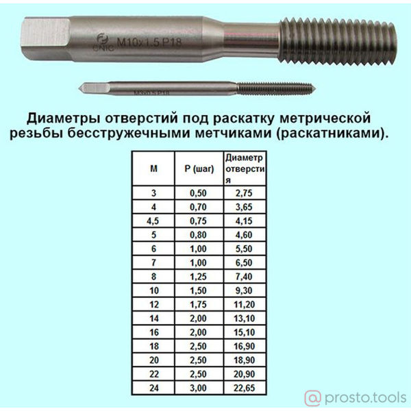 Раскатка бесстружечными метчиками (раскатниками) - холодная формовка. Применяется для получения (с высокой производительностью) резьбы в пластичных материалах таких, как алюминий, медь, сталь Ст2, Ст3 и в специальных марках сталей для холодной штамповки. Формирование резьбы путём деформации может производиться как с использованием смазки и СОЖ так и всухую (только метчиками с покрытиями).