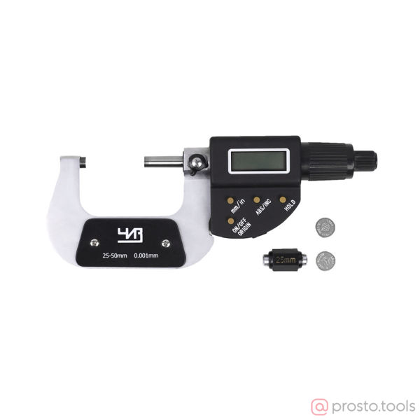 Микрометр МКЦ- 50 0,001 электр. 4-кн. - цифровые микрометры для измерения наружных линейных поверхностей. Используется в области малых размеров с низкой погрешностью (от 2 мкм до 50 мкм в зависимости от класса точности инструмента и измеряемых диапазонов). Преобразовательным механизмом микрометра является микропара винт-гайка. Принцип измерения микрометром построен на перемещение винта вдоль оси при вращении его в неподвижной гайке. Считывание показаний происходит по средствам электронного дисплея, куда они выводятся в готовом виде. Цифровой блок обладает функцией установки инструмента на ‘’нуль’’ и смены системы исчисления с метрической на дюймовую.