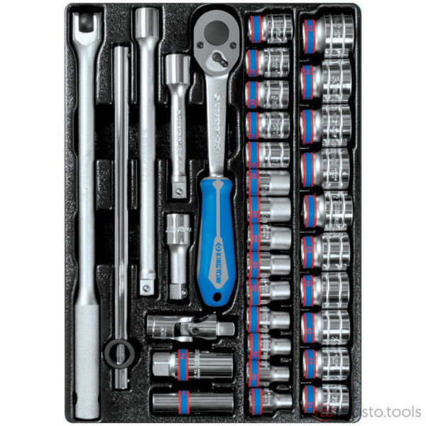 Набор включает в себя широкий ряд торцевых головок, включающий в себя редкие размеры. Два типа воротков: Т-образный и мощный «срывной» вороток длиной 380 мм; удлинители: 75, 125 и 250 мм – позволят проводить работы с различными узлами механизмов, в том числе в труднодоступных местах. Материал ложемента – ПВХ (поливинилхлорид). Изготовлен специально для комплектации инструментальной тележки.