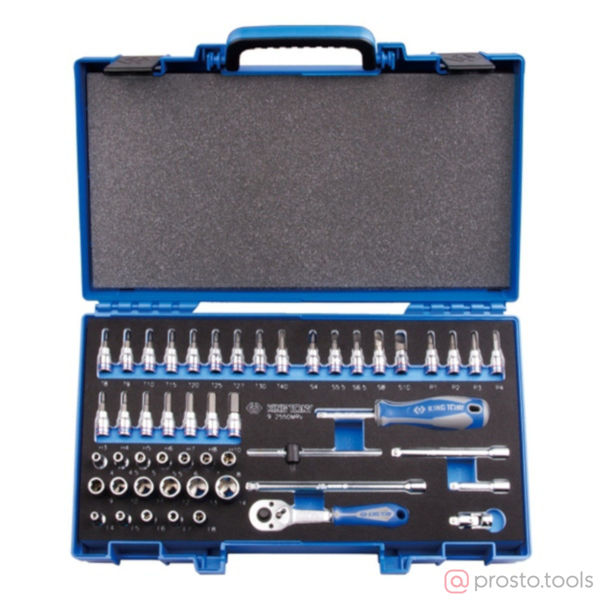 Набор с инструментом торговой марки KING TONY включает в себя торцевые головки, насадки формата 1/4" и принадлежности к ним. Идеально подходит для работы с механизмами небольших габаритов, к примеру, двигателями мотоциклов или скутеров, велосипедов.