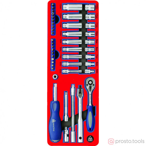 Набор инструментов 45 предметов торцевые головки с присоединительным квадратом 1/4 дюйма и аксессуары Мастак 5-002045 в ложементе из материала EVA предназначен для комплектации передвижных инструментальных тележек или слесарных верстаков при создании индивидуальных рабочих мест на станциях технического обслуживания автомобилей и других предприятиях, занимающихся обслуживанием и ремонтом различной техники.