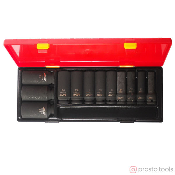 Артикулы JTC-448210-32: ударные шестигранные головоки 1/2": 10 мм., 12 мм., 13 мм., 14 мм., 17 мм., 19 мм., 21 мм., 22 мм., 24 мм., 27 мм., 30 мм., 32 мм.- 12 шт.