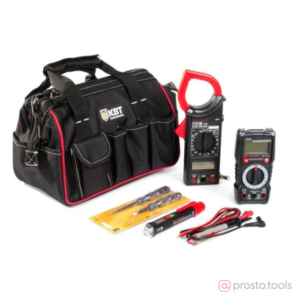 Проведение тестирования, диагностики линий электропередачи, электрических схем, элементов питания (батареи, аккумуляторы) Тип набора: специализированный Состав набора: •Набор индикаторных отверток НИО-02Т; •Детектор напряжения KT-100; •Мультиметр цифровой KT-830L; •Токовые клещи цифровые KT-266F; —Всего в наборе: 6 предметов в сумке электромонтажника С-03