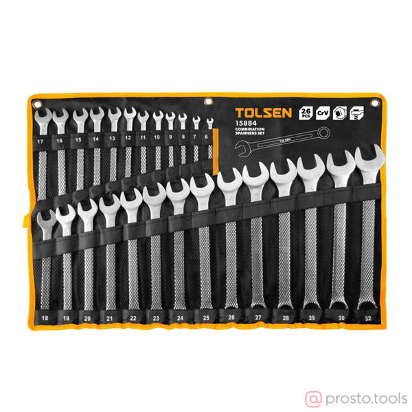 Комплектация • Ключи Комбинированные – 6, 7, 8, 9, 10, 11, 12, 13, 14, 15, 16, 17, 18, 19, 20, 21, 22, 23, 24, 25, 26, 27, 28, 29, 30, 32 мм • Капроновый чехол 770×500 мм (Ш×В) с люверсами Количество предметов – 26 Материалы – инструментальная сталь Cr-V, капрон Упаковка – картонный короб Размеры в упаковке – 463×118×118 мм Вес – 6,140 кг