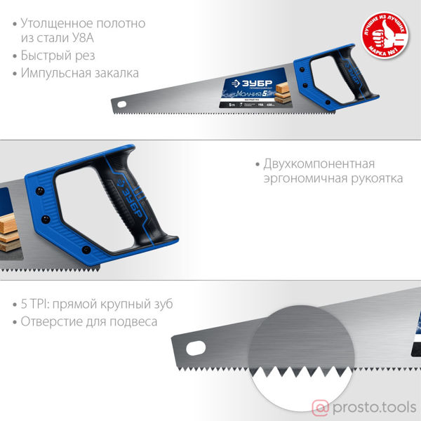 Ножовка по дереву (пила)"МОЛНИЯ-5" 450 мм, 5 TPI, прямой крупный зуб, быстрый рез поперек волокон,