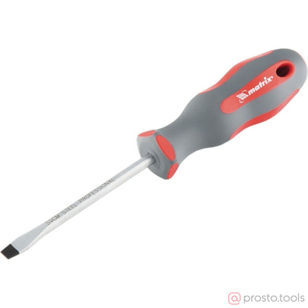 Отвертки серии Matrix Professional представлены полным типоразмерным рядом SL, PH, PZ. Главными преимуществами данной серии отверток является высокое качество изделий, в частности качество стали стержня и жала отвертки, материал, из которого изготовлена двухкомпонентная рукоятка, а также удобное крепление отвертки на подвесной карте. Стержень отвертки изготовлен из стали марки SVCM. По сравнению с распространенными аналогами – сталью S2 и CrV – данную марку стали отличает высокая твердость, жесткость и эластичность, препятствующие износу и разрушению жала. Высокий коэффициент крутящего момента препятствуют излому жала при высоких нагрузках. Твердость стали – 58-56 HRC. Сталь SVCM лишена недостатков, которые имеются у стали аналогичных марок: ее твердость выше, чем у CrV, а гибкость и износостойкость больше, чем у S2. Жало отвертки индукционно закалено, намагничено и имеет фосфатированное покрытие. Эти особенности исключают возможность повреждения «срыва» шлица, возникновения