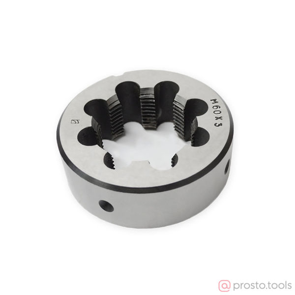 Метрическая плашка с диаметром резьбы 60 мм и шагом резьбы 3 мм. Диаметр плашки составляет 105 мм. Класс точности - 6h. Предназначена для нарезания резьбы за один проход, а также ее калибровки. Может использоваться как для ручной, так и для машинной обработки.