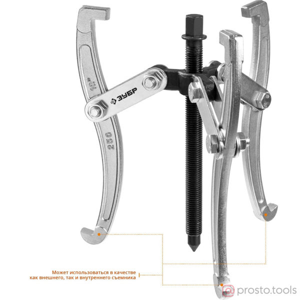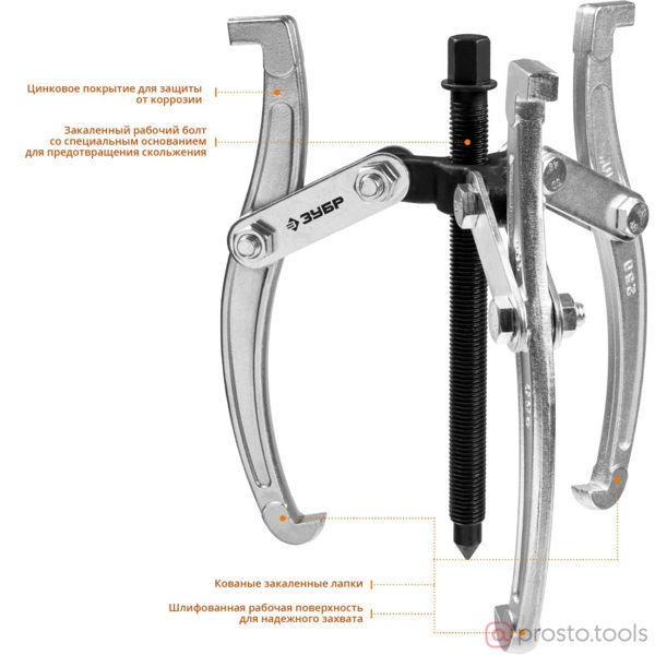 Захваты съемника выкованы из качественной инструментальной стали, что обеспечивает долгий срок службы при работе с высокими нагрузками. Позволяет работать с широким рядом узлов