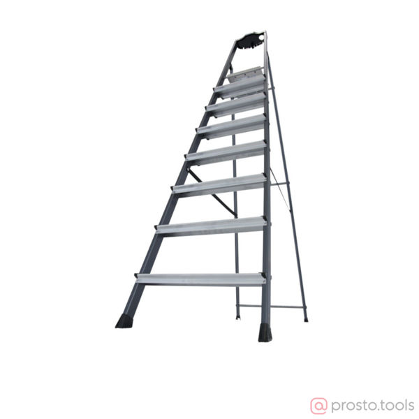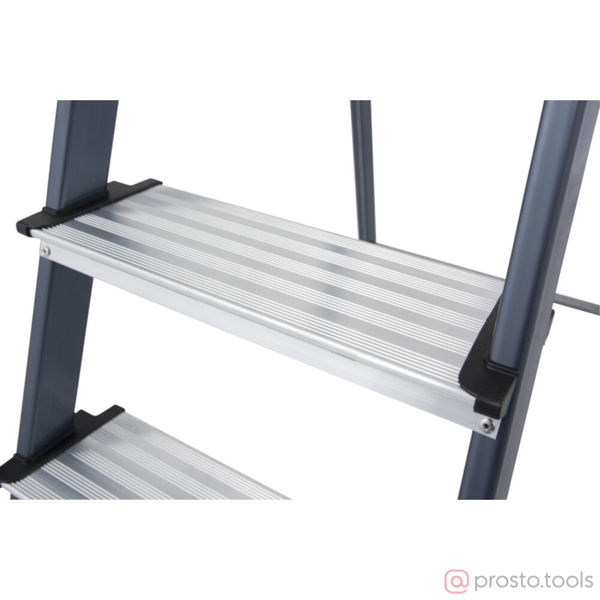 Алюминиевая стремянка с высокой защитной дугой, большой, нескользящей платформой и комфортными ступенями Стабильные прочные боковины подъемной и опорной частей из прямоугольного анодированного алюминиевого профиля Большая функциональная полка с крючком для ведра, отверстиями для инструментов и эргономичной опорой Комфортные ступени шириной 125мм (больше на 60% по сравнению со стандартом) Многократное прочное заклепочное соединение ступенек с боковинами Противоскользящие опорные наконечники обеспечивают устойчивое положение