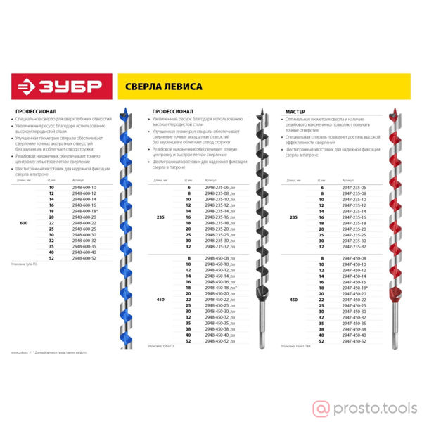 Сверло по дереву, спираль Левиса, HEX хвостовик, ЗУБР Мастер 2947-235-06, d=6х235мм
