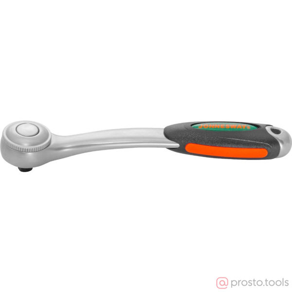 Трещоточная рукоятка с изогнутой ручкой и дисковым переключателем направления вращения обеспечивает очень маленький 5° обратный ход благодаря конструкции храпового механизма. Изогнутая форма ручки позволяет использовать изделие при обслуживании заглубленного крепежа без опаски повреждения руки оператора. Трехкомпонентная резинополимерная рукоятка обеспечивает надежное удержание инструмента. К особенностям эксплуатации можно отнести необходимость достаточно частого обслуживания, чистых рук пользователя и свободной от загрязнений рабочей зоны. Применяются при производстве работ со слабонагруженными резьбовыми соединениями. Не имеют альтернативы (за исключением трещоточных ключей) при использовании в ограниченных рабочих пространствах.