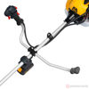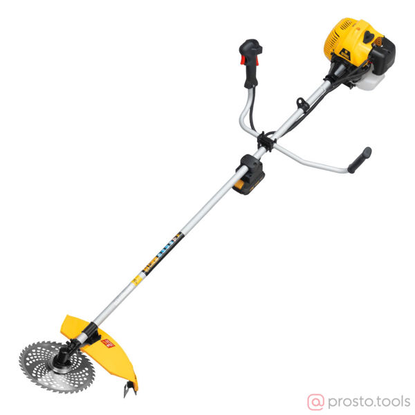 Бензиновый триммер Denzel DT-43E 962015 с двигателем объемом 43 куб. см, с неразъемной штангой и электростартером, поставляется комплектом из 2 частей и используется для ухода за дачным участком. С его помощью можно подравнять газон, скосить траву любого типа, в том числе с жесткими древовидными стеблями (полынь, крапива, лебеда, борщевик), а также срезать кустарник и молодые побеги деревьев с диаметром стволов до 10 мм. Триммер успешно справляется с этими задачами благодаря входящим в комплект катушке с леской и пильному диску с шириной скашивания 42 и 25,5 см соответственно. На штангу уже установлен редуктор и корпус сцепления, что упрощает подготовку инструмента к работе.