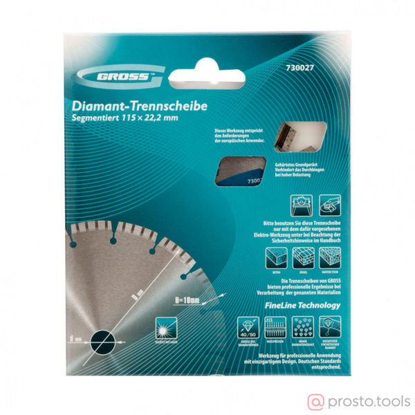 Универсальный алмазный диск ТМ GROSS предназначен для резки материалов: бетон, армированный бетон, кирпич, камень, гранит, шлакоблок, мрамор, тротуарная плитка. Тип диска 1A1RSS Turbo с лазерной приваркой сегментов, обеспечивает наилучшее крепление сегментов, повышая стойкость диска к перегрузкам и перегреву. Режущий сегмент высотой 10 мм, с высокой концентрацией крупных синтетических алмазов ? 40–50 мкм повышает износостойкость диска и увеличивает скорость реза. Для использования на УШМ (болгарке) соответствующего типоразмера. Сухой рез, без использования водяного охлаждения. Рекомендован для профессионального использования и большого объема работ.
