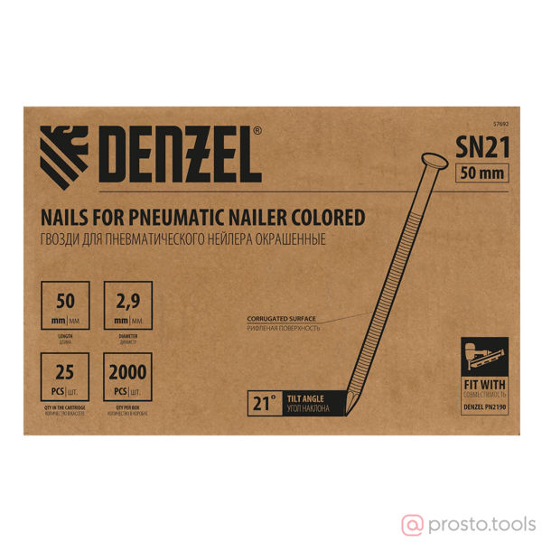 Гвозди Denzel 57692 типа SN21, длиной 50 мм и диаметром 2,9 мм, с крашеной поверхностью, 2000 шт. в упаковке, — расходники для пневматического нейлера. Используются для скрепления различных материалов, будут полезны во время сборочных и отделочных работ. Преимущества Прочность — крепежные элементы изготовлены из стали. Надежное и долговечное соединение — гвозди не гнутся, рифленая рабочая часть исключает их самопроизвольный выход из своих гнезд. Удобная комплектация — запаса из 2000 шт. хватит для выполнения большого объема работ.