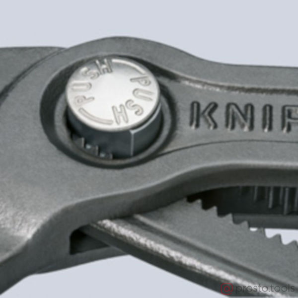 Регулировка прямо на детали простым нажатием кнопки. Настройка непосредственно на детали при одновременно удобном расположений пучек. Функция смыкания губок, которая облегчает работу в узких и труднодоступных местах. Захватные губки со специально закаленными зубцами твердостью примерно 61 HRC: прослужат долго с надежным захватом. Коробчатый шарнир: высокая стабильность благодаря двум направляющим. Надежная фиксация винта шарнира: случайная перестановка исключается. Специальный механизм предотвращает случайное защемление пальцев. Хромованадиевая сталь, кованая, многократно закалённая в масле. Инструмент с креплением для страховки от падения с высоты.