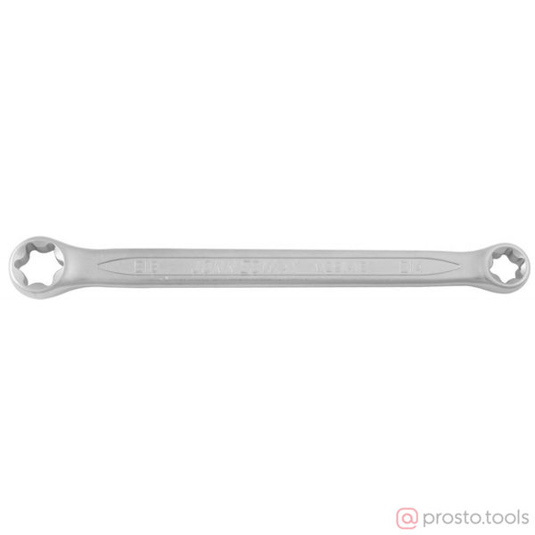 Ключ с кольцевой рабочей частью. Применяется для обслуживания резьбовых крепежных элементов, снабженных головками, имеющими рабочий профиль E-TORX®. Изготовлен из хромо-ванадиевой стали, закален, имеет хромоникелевое покрытие. Ключи гаечные кольцевые двусторонние коленчатые, более известные потребителям как накидные или просто кольцевые ключи – гаечные ключи, имеющие округлую форму рабочей части, что позволяет при проведении работ по откручиванию или закручиванию охватывать крепежное соединение со всех сторон. Тем самым, накидные ключи незаменимы при работе с тугими крепежными соединениями, позволяют за счет своей формы прилагать большие усилия, чем при работе с рожковыми ключами, имеющими только две грани контакта с гайкой или болтом, что и обуславливает популярность и востребованность кольцевых ключей на рынке. Область применения Универсальные гаечные ключи. Применяются в качестве основного ручного инструмента при проведении работ с высоконагруженными резьбовыми соединениями. Изогнутая рабочая часть облегчает применение ключей в труднодоступных местах. Изготовлены в соответствии со стандартом DIN 838 из хромованадиевой стали, закалены, имеют хромоникелевое покрытие, полностью соответствуют ГОСТ 2838-80.