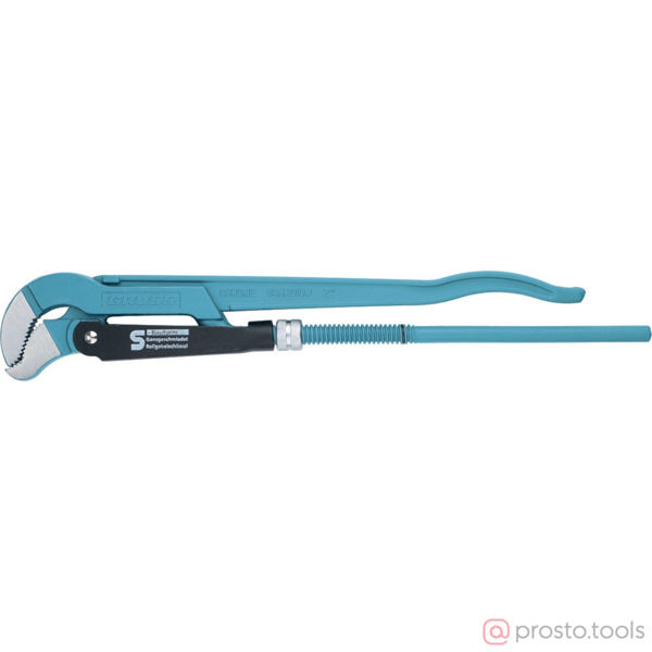 Ключ трубный рычажный типа S усиленной конструкции, применяется при повышенных нагрузках. Предназначен для захватывания и вращения труб и соединительных частей трубопроводов. Изготовлен из высококачественной хромованадиевой стали. Имеет порошковое антикоррозийное покрытие. Губки дополнительно закалены токами высокой частоты до твердости 57–60 HRС. Прогрессивная форма зуба с наклоном против направления вращения обеспечивает самоблокируемый захват деталей. Верхняя ручка имеет выштампованный Т-образный профиль. Регулировочная гайка снабжена стопорным кольцом.