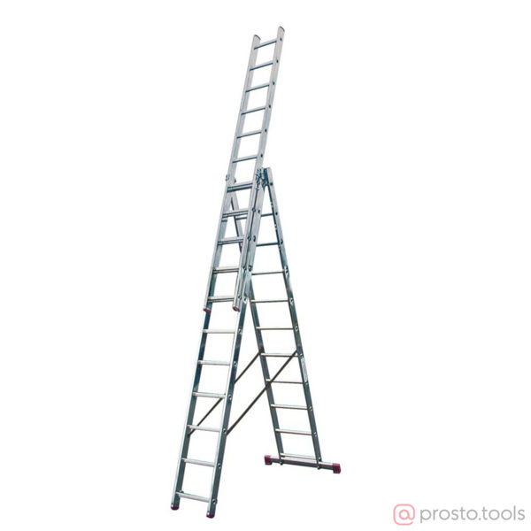Алюминиевая трехсекционная лестница с перекладинами, универсального применения: может использоваться как приставная и выдвижная лестница или как стремянка Прочный стальной направляющий профиль обеспечивает удобное выдвижение лестницы Профилированные со всех сторон перекладины для безопасного подъема и спуска Широкая поперечная траверса с двухкомпонентными заглушками увеличивает опорную площадь Противоскользящие двухкомпонентные опорные заглушки: твердый материал обеспечивает прочное соединение с боковиной, мягкий материал обеспечивает надежное сцепление с опорной поверхностью и препятствует нежелательному скольжению лестницы Самофиксирующиеся крюки-защелки препятствуют произвольному выскальзыванию секций при работе и транспортировке Устойчивые к атмосферным воздействиям ремни препятствуют нежелательному раздвижению лестниц в рабочем положении