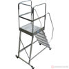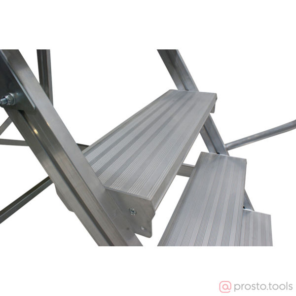 Односторонняя алюминиевая передвижная лестница с площадкой. Широкие ступени, двусторонние перила и трёхсторонее ограждение площадки. + Большая площадка 700х600 мм, и компактная конструкция делают лестницу удобной для использования на ограниченных площадях + Широкие ступени 175 мм предназначены для максимальных удобства и безопасности при подъёме + Двусторонние перила на подъёмной части входят в комплектацию + Трёхстороннее ограждение площадки высотой 1,05 м с защитной планкой на уровне колен и плинтусом + 4 поворотных, оборудованных тормозами ролика с прорезиненным покрытием для мягкого хода + Все соединения произведены заклёпочным или болтовым способом, что позволяет производить замену отдельных деталей + Поставка осуществляется в предварительно собранных модулях + Продукт сертифицирован в строгом соответствии с ГОСТ 24258-91