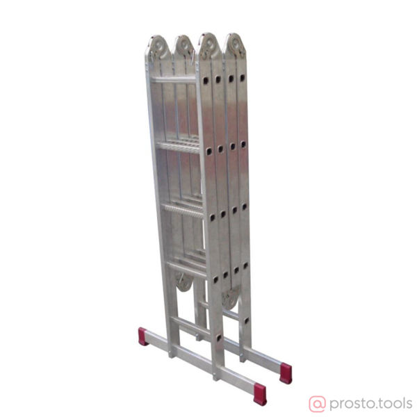 Четырехсекционная универсальная алюминиевая шарнирная лестница: применяется как двусторонняя стремянка, как приставная лестница и как рабочая платформа Легко и быстро складывается, умещается в багажнике автомобиля Две широкие поперечные траверсы с двухкомпонентными заглушками увеличивают опорную площадь