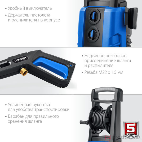 Профессиональные мойки высокого давления, оснащенные бесщеточным двигателем с низкими оборотами и высоким крутящим моментом, используются как для бытовых нужд, так и в сфере клининга или на профессиональной автомойке. Благодаря системе полной остановки, помпа не работает при ненажатом пистолете – это экономит воду и ресурс изделия при неизбежных паузах в работе. Элегантный дизайн и удобная конструкция с держателями для аксессуаров делают работу с изделием комфортной. Регулировка давления и формы выходной струи позволяет обрабатывать различные поверхности - автомобили, стены, велосипеды, напольные покрытия и т.п. Преимущества Функция самовсасывания позволяет использовать изделие без внешнего источника давления воды Система полной остановки выключает двигатель при отпускании клавиши пистолета, что экономит энергию и увеличивает ресурс помпы Шланг длиной 8 м позволяет производить обработку без необходимости перемещать мойку Барабан для предохранения шланга от перегибов при использовании и хранении и продления срока его службы Высокая мощность выходной струи для эффективной мойки Сменные быстросъемные насадки с различными углами распыления для формирования струи различного давления, а также нанесения моющего средства: - красная - угол распыления 0 градусов, - зеленая - угол распыления 25 градусов, - белая - угол распыления 40 градусов, - черная - для нанесения моющего средства Прилагаемый фильтр на вход для защиты помпы от загрязнений в воде Встроенный бачок для моющего средства для предварительной обработки пенным составом Поворотный крюк для крепления и простого снятия кабеля Колеса и удлиненная рукоятка для простоты перемещения Использование Для образования струи воды высокого давления, используемой для мойки автомобилей, велосипедов и другой колесной техники, садового инвентаря, наружных стен и уличных покрытий. Изделие предназначено для использования только вне помещений