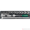 Основная разновидность рабочих насадок сборного слесарно-монтажного инструмента - это торцевая головка. Торцевые головки разделяются по геометрии рабочего профиля, по длине и по назначению. Такие инструменты обеспечивают наилучшие условия для приложения рабочего усилия по сравнению с другими видами инструмента для работы с внешними рабочими профилями. 6-гран. рабочий профиль считается наилучшим с точки зрения приложения максимальных рабочих нагрузок, передаваемых крепежной детали. Система инструмента с присоединительным квадратом 1/2" является сегодня самой универсальной, покрывая самый большой диапазон размеров от 8 до 36 мм. За её рамками находятся лишь несколько самых мелких размеров и размеры крепежа, применяемые в крупногабаритных конструкциях. Данная система самая «богатая» по количеству разнообразных насадок, вариантов переходников и приводов и поэтому инструмент с присоединительным квадратом 1/2" является основой, на которой строится вся система сборного слесарно-монтажного инструмента предприятия. Торцевые головки 1/2" позволяют прилагать рабочие нагрузки, которые только в состоянии выдержать резьбовые соединения. Торцевые головки набора выполнены из хромованадиевой стали, имеют накатку и полуматовое хромоникелевое покрытие.