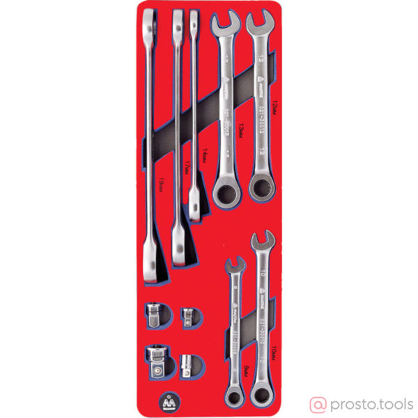 Набор инструментов 11 предметов ключи комбинированные трещоточные рожково-накидные и адаптеры Мастак 5-21311 в ложементе из материала EVA предназначен для комплектации передвижных инструментальных тележек или слесарных верстаков при создании индивидуальных рабочих мест на станциях технического обслуживания автомобилей и других предприятиях, занимающихся обслуживанием и ремонтом различной техники.