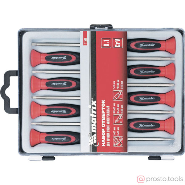 Набор отверток торговой марки Matrix предназначен для завинчивания и отвинчивания резьбовых соединений маленького размера. Отвертки из данного набора незаменимы при работе с электроникой, часами и прочими мелкими соединениями. Эргономичная двухкомпонентная рукоятка удобно располагается в руке и позволяет с ювелирной точностью манипулировать мелкими деталями. Тыльная сторона отвертки оснащена поворотной шайбой. При помощи шайбы можно легко и быстро вращать инструмент простым перебором пальцев. Упакован набор в пластиковый бокс, удобный для хранения и транспортировки.