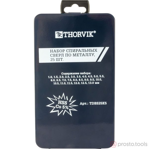 Набор спиральных сверл по металлу Thorvik TDBS25K5 предназначен для обработки чугуна, углеродистых и конструкционных сталей, нержавеющих и жаропрочных сплавов. Сверла изготовлены из быстрорежущей инструментальной стали с содержанием кобальта 4,8 - 5,0%.