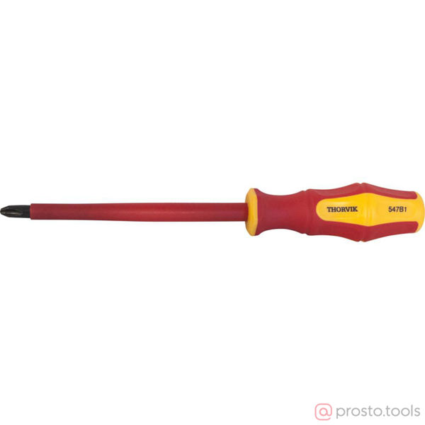 Отвертка стержневая диэлектрическая крестовая VDE 1000V, PH0x60 мм. Отвертки Thorvik изготовлены в соответсвии с требованиями стандарта DIN 5262, отвечают техническим условиям ГОСТ 17199-88. Изделия комплектуются высококачественными стержнями из хромованадиевой стали. Намагниченные рабочие части отверток в состоянии удерживать крепеж, что очень часто помогает при работе в труднодоступных местах. Эргономичные двухкомпонентные рукоятки удобно лежат в руке. Мы предлагаем несколько типов отверток Thorvik, которые применяются для работы с резьбовыми крепежными деталями с внутренними рабочими профилями: шлиц прямой, Phillips (крест), Pozidriv. По конструкции отвертки можно разделить на инструменты со скрытой установкой стержня в рукоятке, отвертки со сквозной установкой стержня, имеющие стальной затыльник и шестигранный усилитель момента, и диэлектрические отвертки. Размеры Артикул Размер l, мм L, мм Вес, кг SDPI060 PH0 60 148 0,05
