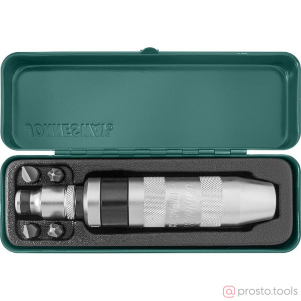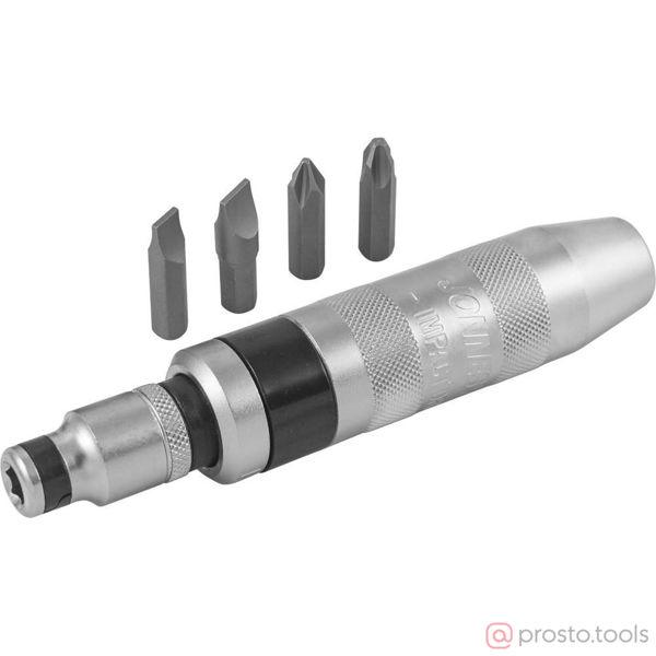 Ударно-поворотная отвертка с цельным корпусом и набором вставок-бит L-36 мм, изготовленных из стали S2. Привод отвертки изготовлен из хромомолибденовой стали. Корпус имеет матовое, хромоникелевое покрытие. Область применения Предназначены для работы с осложненными резьбовыми соединениями, для ослабления которых требуется совмещать приложенный момент с вибрационной (ударной) нагрузкой.