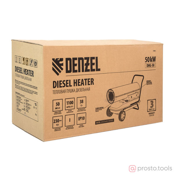 Дизельная тепловая пушка Denzel DHG-50 96486 мощностью 50 кВт и производительностью 1100 куб. м/ч предназначена для прямого нагрева воздуха в цехах, ангарах, хранилищах и других нежилых помещениях с хорошей вентиляцией. Максимальная площадь обогрева составляет 500 кв. м. Пушка служит эффективным источником тепла в полярных экспедициях. Пригодится также на строительной площадке для прогрева бетона, просушки стен и разморозки траншей. Для заправки может использоваться любое дизельное топливо: летнее, зимнее и арктическое.ПреимуществаВстроенная система безопасности — подача топлива прекращается в случае затухания пламени, перегрева и отключения питания.Эффективность — благодаря системе прямого нагрева и теплоотражающему экрану воздух в помещении прогревается быстро и равномерно.Низкий расход топлива — продолжительность работы без дозаправки составляет 9 часов.Датчик уровня топлива — своевременная заправка бака позволяет избежать перерывы в работе.Защита от засорения — встроенный фильтр грубой очистки препятствуе