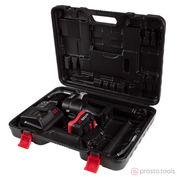 Комплектация – Шприц плунжерный аккумуляторный DGG-102 – Шланг с наконечником – Ремень с карабином – Аккумулятор DB-1850A – Зарядное устройство DC-18A – Инструкция по эксплуатации – Кейс из PE-HD пластика
