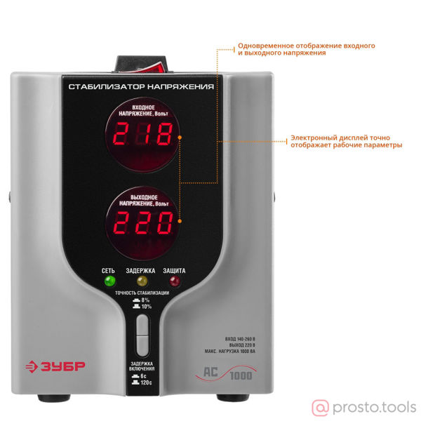 Стабилизатор напряжения автоматический ЗУБР "ПРОФЕССИОНАЛ", 1-фазный, релейный, 1000 ВА, 140-260 В,