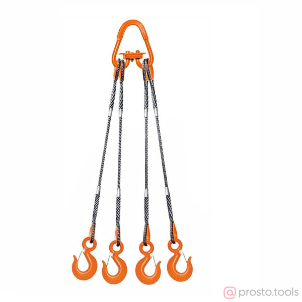Четырёхветвевой канатный строп 4СК изготавливается из отрезков светлого или оцинкованного стального каната. Заделка концов осуществляется методом опрессовки алюминиевой втулкой.