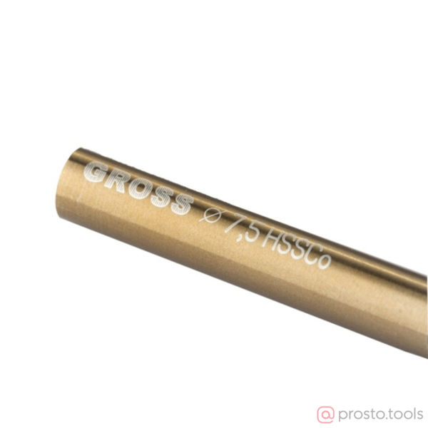 Сверло спиральное торговой марки GROSS относится к режущим инструментам и предназначено для получения отверстий в легированной и нелегированной стали, чугуне, цветных сплавах и жестких пластиках. Диаметр сверла составляет 7,5 мм, длина сверла — 109 мм, а длина спиральной части — 69 мм. Изготовлено сверло из быстрорежущей (HSS) легированной стали М35 с добавлением кобальта, улучшающего такие механические свойства стали, как твердость и износоустойчивость при повышенных температурах. Подточка перемычки уменьшает осевую силу резания, что значительно облегчает работу.