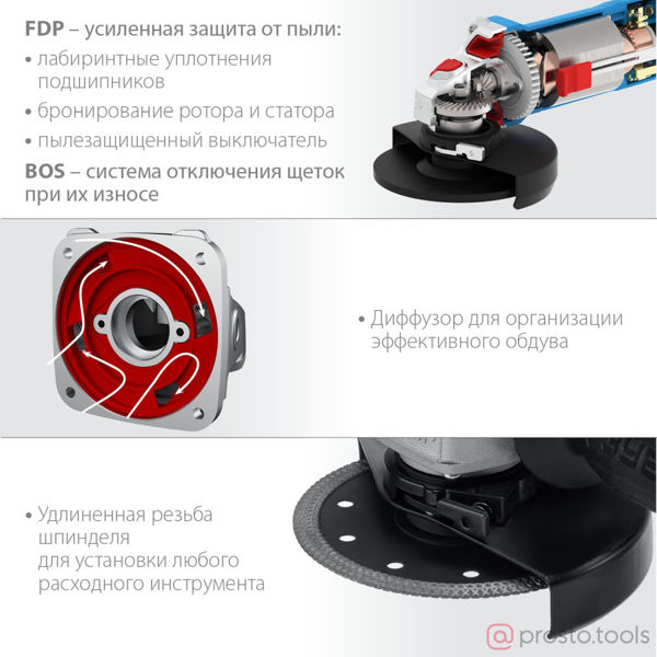 Одноручная УШМ с мощностью 1100 Вт и регулировкой оборотов максимально эффективна для всех видов работ - резки металла, кирпича, керамики, зачистки, шлифовки и обдирки. Удобная эргономика (малый диаметр корпуса под хват, быстрая регулировка кожуха), а также низкие уровень шума и вибрации делают высокопроизводительную работу еще и комфортной