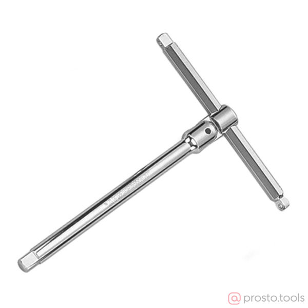 Универсальный инструмент, использующийся в качестве Т- или Г-образного воротка с удлинителем, при этом позволяющий производить операции с насадками 1/4’’DR, 3/8’’DR и 1/2’’DR без каких либо адаптеров. Изготовлен из хромонадиевой стали, имеет зеркальное хромоникелевое покрытие. Размер в Т-образном состоянии 200х250 мм при массе 700 гр.